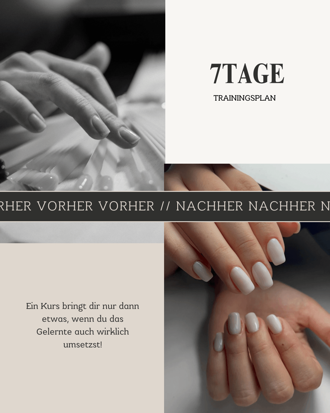 Du bekommst einen klaren 7-Tage-Plan, mit dem du Schritt für Schritt dein gewünschtes Ergebnis erreichst – aber nur, wenn du ihn wirklich umsetzt. Diese Investition kann sich schon in der ersten Woche auszahlen: Du wirst deine Behandlungszeit deutlich reduzieren und endlich effizient arbeiten. Statt in mehreren Stunden nur eine Kundin zu bedienen, kannst du zwei oder sogar drei Kundinnen schaffen – oder dir bewusst Zeit nehmen, dich weiterzuentwickeln, statt dich im Chaos zu verlieren.